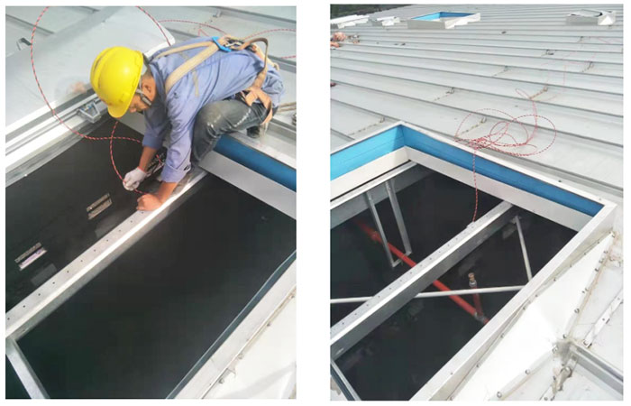 徐州鑫友排煙天窗安裝團隊入駐浙江5210物資公司寧波工廠,正式進入PM包裝廠房,備品備件立體庫的圓拱形天窗施工安裝中。上圖為安裝人員利用升降車作業(yè)中。